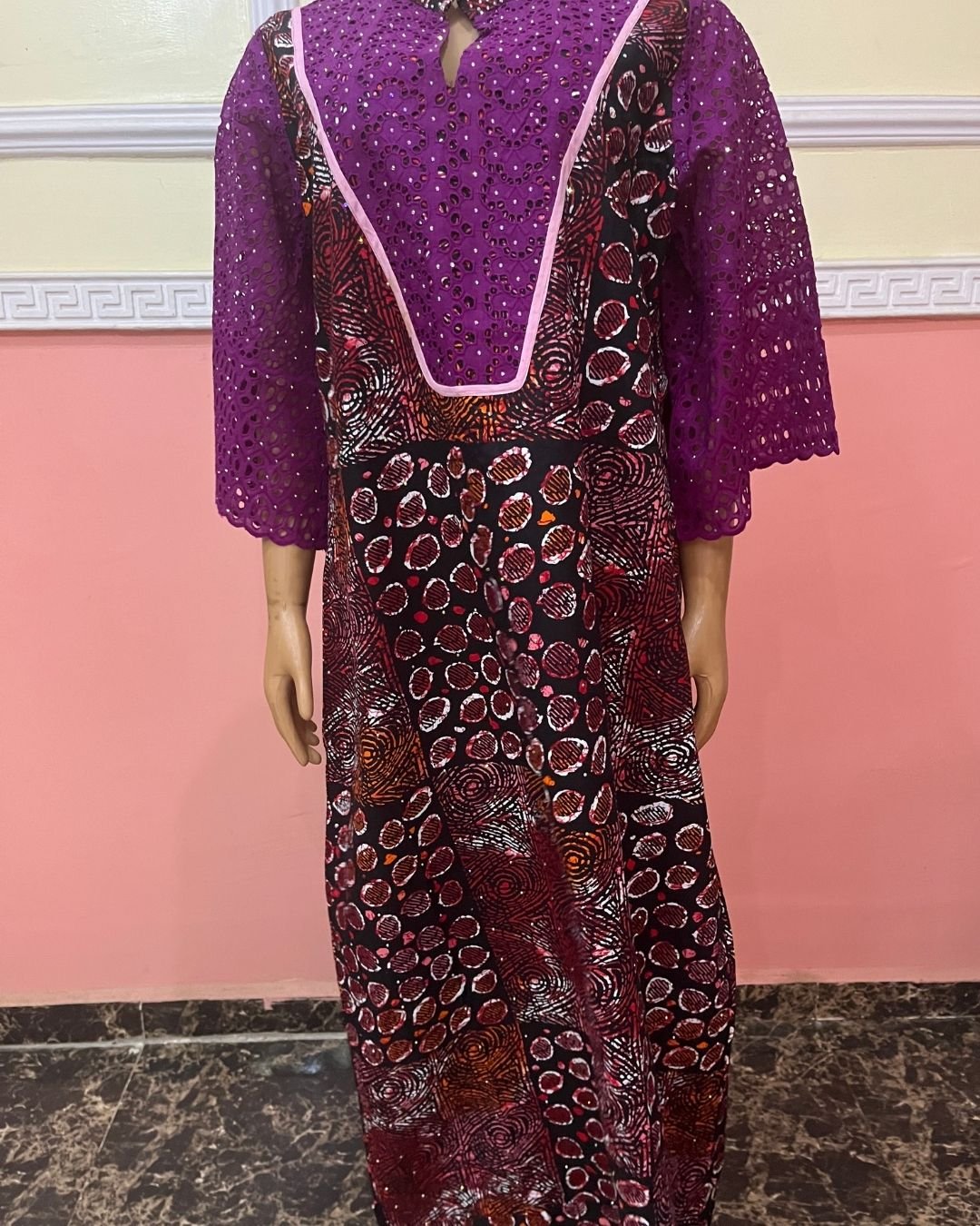 Introducing the Adunni Bloom Heritage Gown – Purple Luxe Edition, a sophisticated blend of tradition, elegance, and bold African craftsmanship. This gown is crafted using a striking combination of detailed patterned Ankara prints and rich embroidered lace bodice, creating a unique and refined silhouette. The upper bodice features intricate purple eyelet embroidery with a soft pink bordering, adding a luxurious and feminine touch.