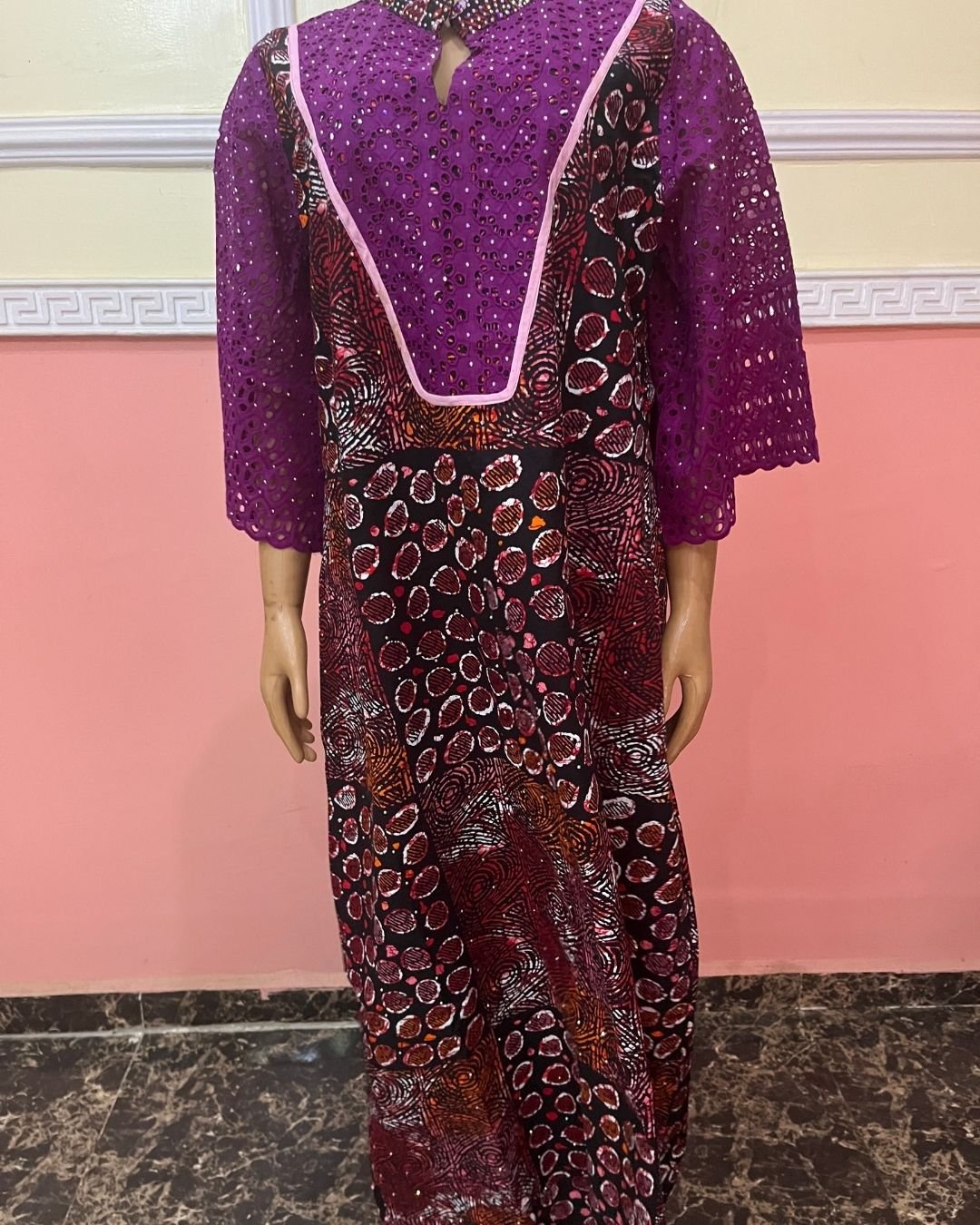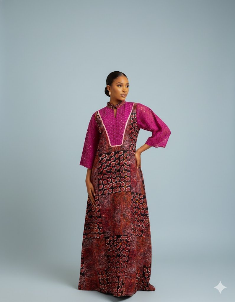 The lower body showcases a multi-patterned blend of circular and abstract prints, giving the gown an expressive cultural presence while maintaining comfort and effortless movement. Ideal for special events, traditional gatherings, church outings, or sophisticated casual wear, this gown elevates your style with its harmony of color, texture, and craftsmanship.