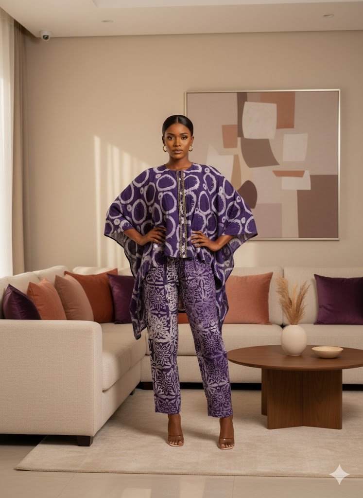 Crafted from premium hand-dyed Adire fabric, this two-piece ensemble features a flowing batwing top and tailored trousers, both detailed in rich indigo tones with intricate circular and floral motifs. The relaxed yet regal silhouette celebrates modern African femininity — graceful, confident, and effortlessly commanding.