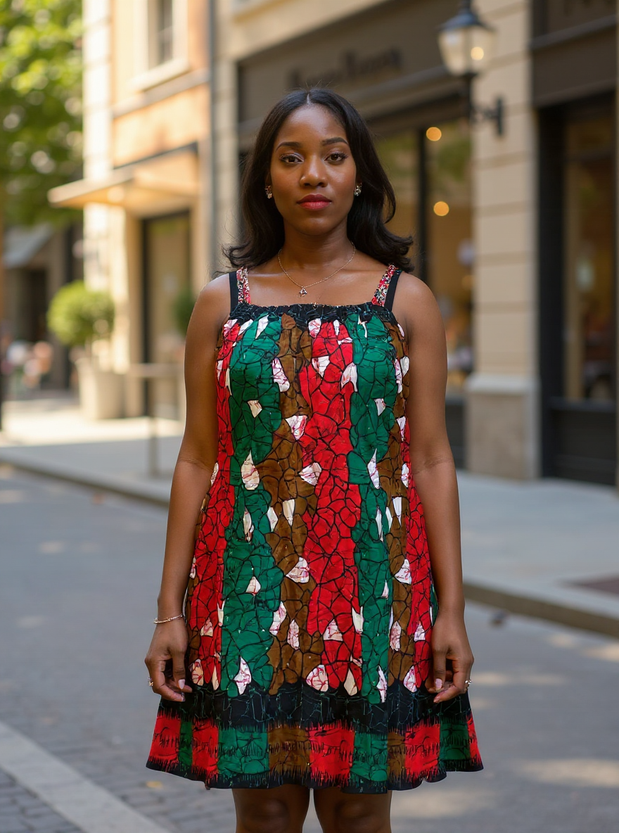 Turn heads with the Urban Bloom Ankara Dress, a vibrant expression of culture and modern street elegance. This colorful dress features a striking blend of green, red, brown, and white patterns that harmonize beautifully with the soft glow of natural light. Designed for confidence and movement, it celebrates African artistry while maintaining a chic, contemporary silhouette.