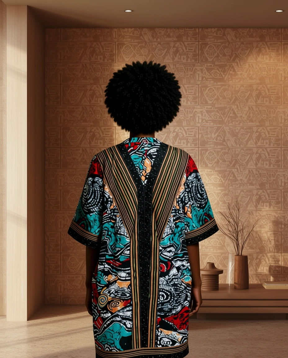 Perfect for casual outings, creative workspaces, or fashion-forward social events, this robe captures both elegance and individuality. The soft, diffused tones complement dark skin beautifully, while the overall design celebrates the fusion of heritage and modern fashion.