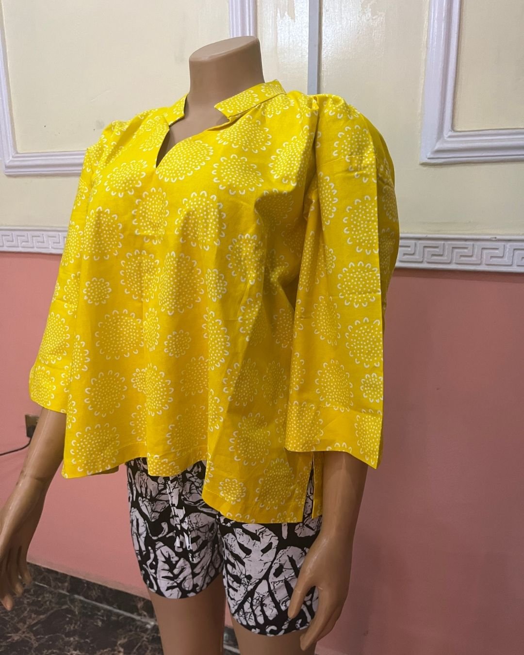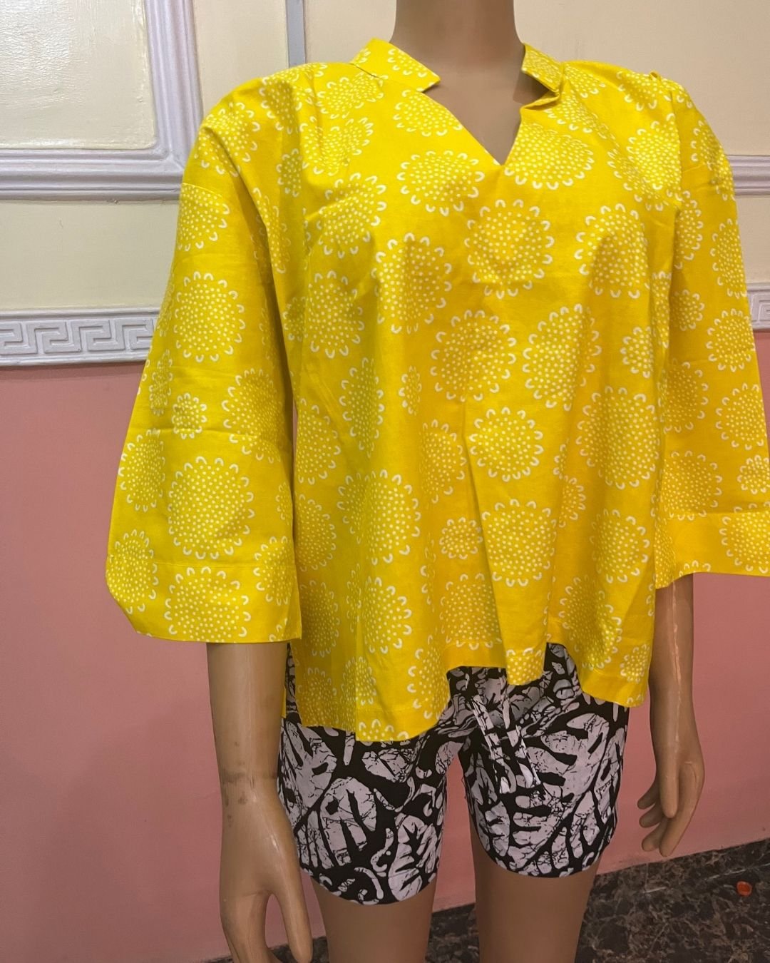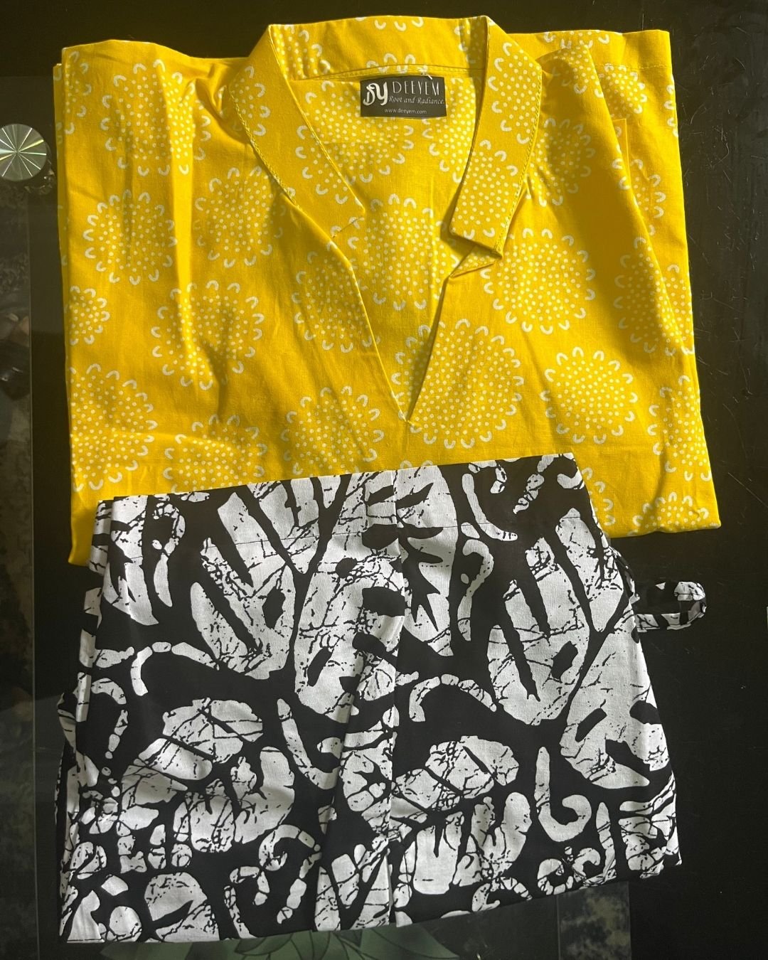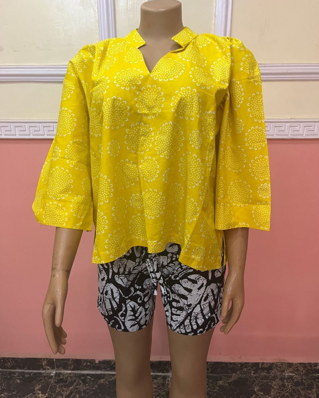 The Zuri Sunshine Blossom Set is a bright, uplifting two-piece designed for women who love bold colour and easy elegance. The top features a radiant sunshine-yellow print with delicate circular floral patterns, created to brighten any wardrobe. Its relaxed silhouette and soft V-notch neckline give it a modern yet culturally grounded feel. Paired with monochrome leaf-print shorts, this set blends traditional African patterns with contemporary styling, offering comfort, versatility, and standout beauty for casual outings, vacations, and relaxed occasions.
